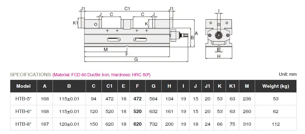 El sistema de bloqueo de ángulo, fabricado en fundición dúctil de grado superior a FCD 60, baja automáticamente la pieza de trabajo a una posición precisa con una tolerancia de ±0,01 mm bajo una fuerza de sujeción de 4500 kg. Esto garantiza una alta rigidez y precisión durante el mecanizado. Las cubiertas dobles del husillo protegen contra las virutas y prolongan la vida útil de la prensa.